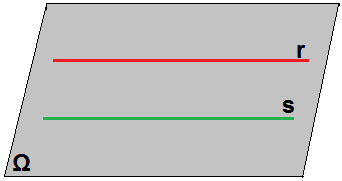 Veja na figura abaixo um exemplo de duas retas paralelas r e s. Observe que ambas pertencem ao plano Ω e não existe ponto em comum.